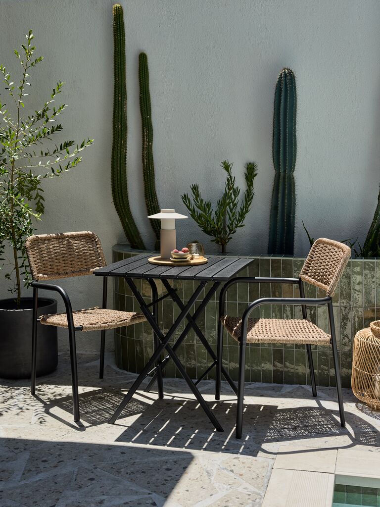 Sort cafébord med bordplade i kunsttræ. Stel og ben i pulverlakeret stål. Bordet kan foldes fladt og opbevares nemt. Kunstigt træ har udseende og tekstur af naturligt træ uden behov for vedligeholdelse. B65 x L65 x H73 cm