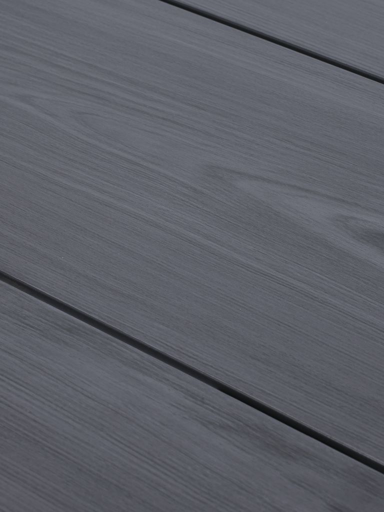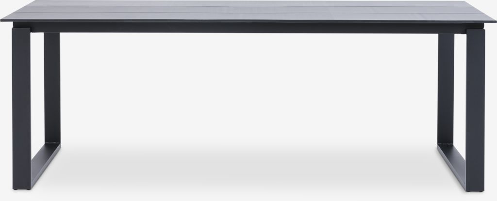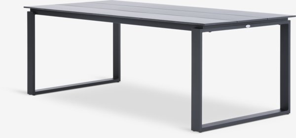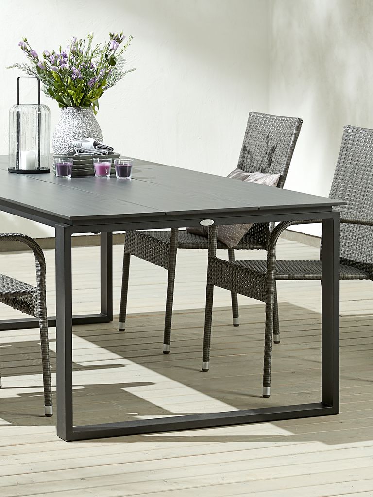 Gråt havebord med bordplade i DURAWOOD® komposittræ. Stel og ben i pulverlakeret aluminium. DURAWOOD® er et slidstærkt sammensat materiale, der består af FSC-hårdttræsfibre® og plast. Det har udseende og tekstur af naturligt træ uden behov for vedligeholdelse. Aluminium er et let og robust materiale, der ikke ruster. B100 x L215 x H75 cm