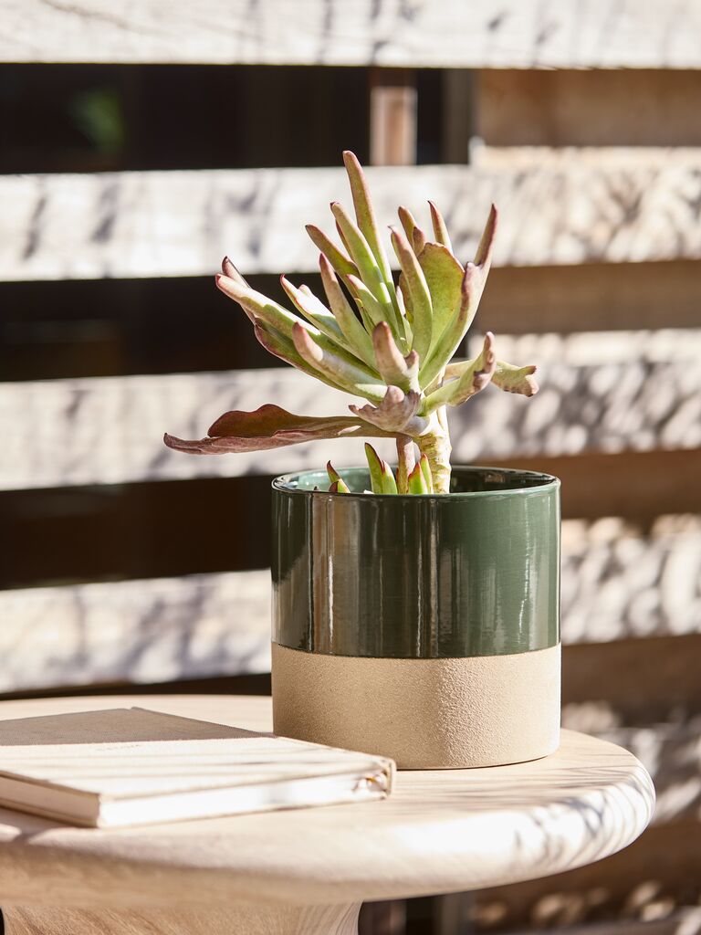 Havekrukke fremstillet af lertøj og ler med et moderne, tofarvet design. Den øverste del har et mørkegrønt, blankt look, der står i kontrast til den naturlige, teksturerede finish på basen. Ø16 x H15 cm
