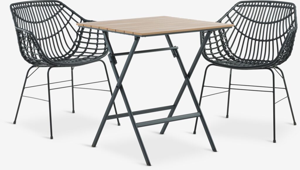 2-personers cafésæt. Bord: Stål og kunsttræ. Kan klappes sammen. B65 x L65 x H73 cm. Stol: Stål og polyrattan.