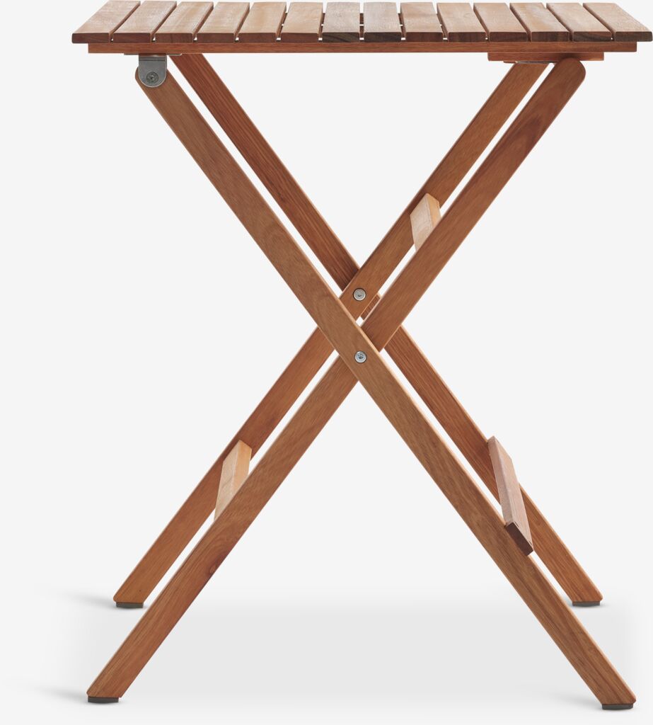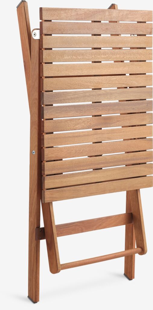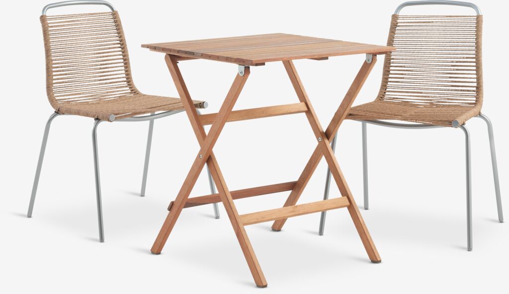 2-personers cafésæt. Bord: Olieret FSC® hårdttræ. Sammenklappelig. B62 x L62 x H74 cm. Stol: Stål og polyrattan. Stabelbar.