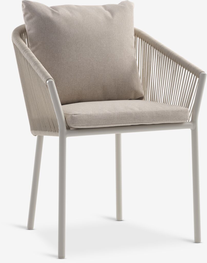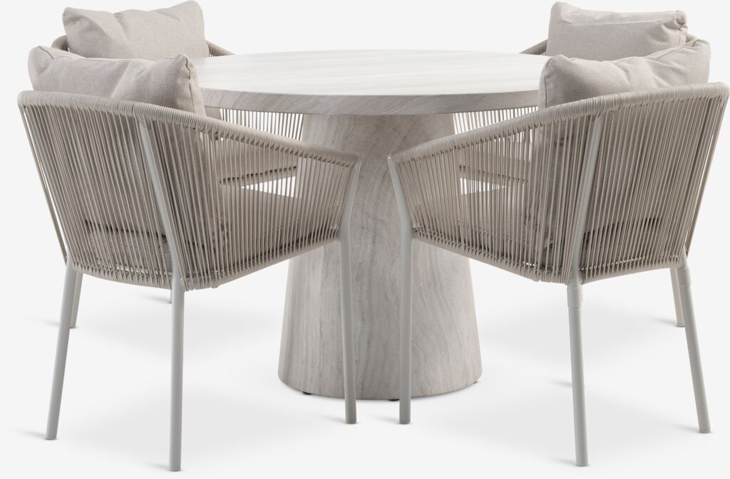 4-personers havemøbelsæt. Bord: Fibercement. Ø110 x H75 cm. Stol: Aluminium og polyester. Inkl. luksushynder med hurtigtørrende, strukturvævet betræk. Stabelbar.