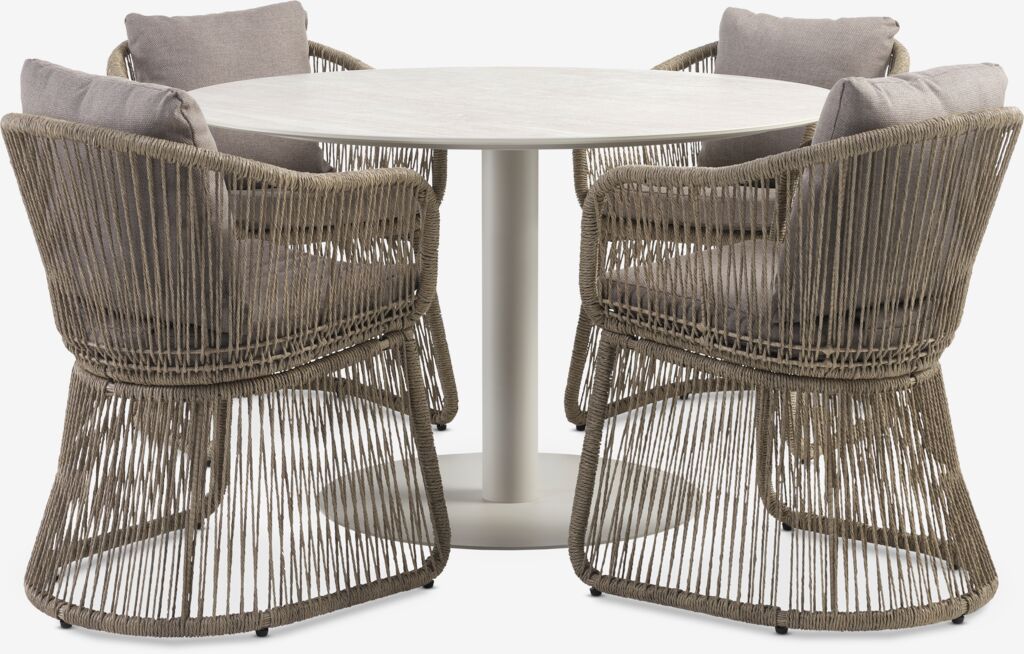 4-personers havemøbelsæt. Bord: Stål og cement. Ø120 x H74 cm. Stol: Stål- og polyethylenreb. Inkl. luksushynder med slidstærkt, strukturvævet betræk.