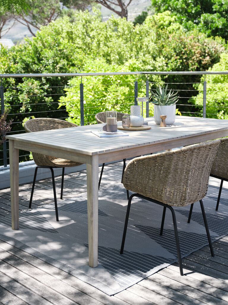 4-personers havemøbelsæt. Bord: Olieret FSC®-hårdttræ. B100 x L205 x H75 cm. Stol: Stål og polyrattan.