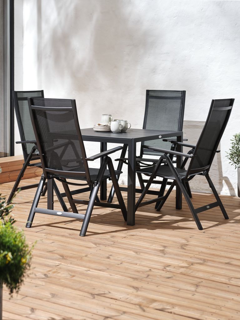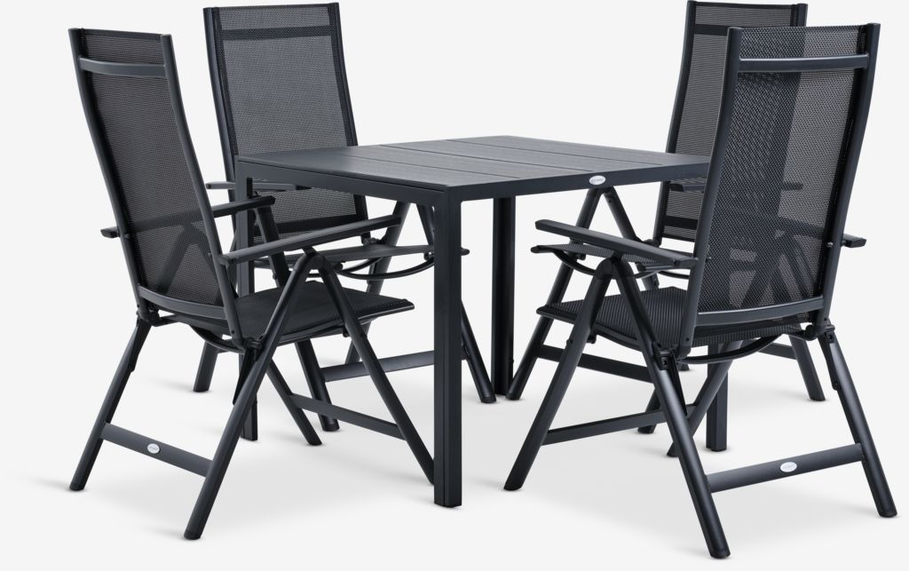 4-personers havemøbelsæt. Bord: Aluminium og kunsttræ. B90 x L90 x H74 cm. Stol: Aluminium og textiline. 6 positioner. Kan klappes sammen.