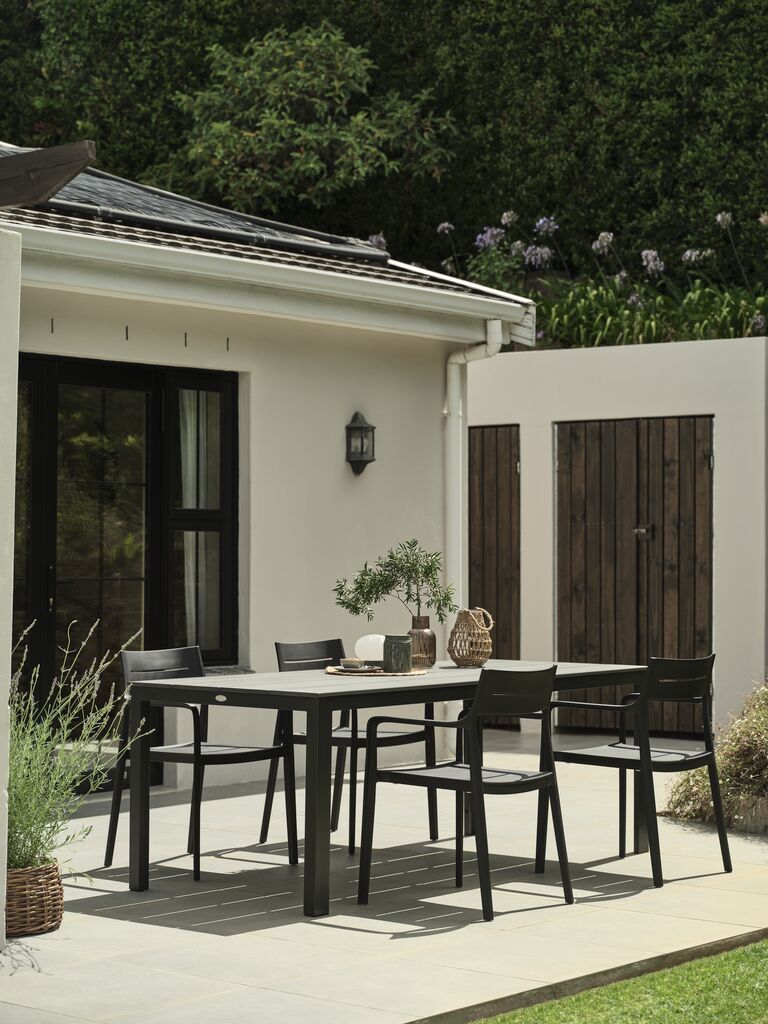 4-personers havemøbelsæt. Bord: Aluminium og kunsttræ. B90 x L205 x H74 cm. Stol: UV-beskyttet plast (20% genanvendt). Stabelbar.