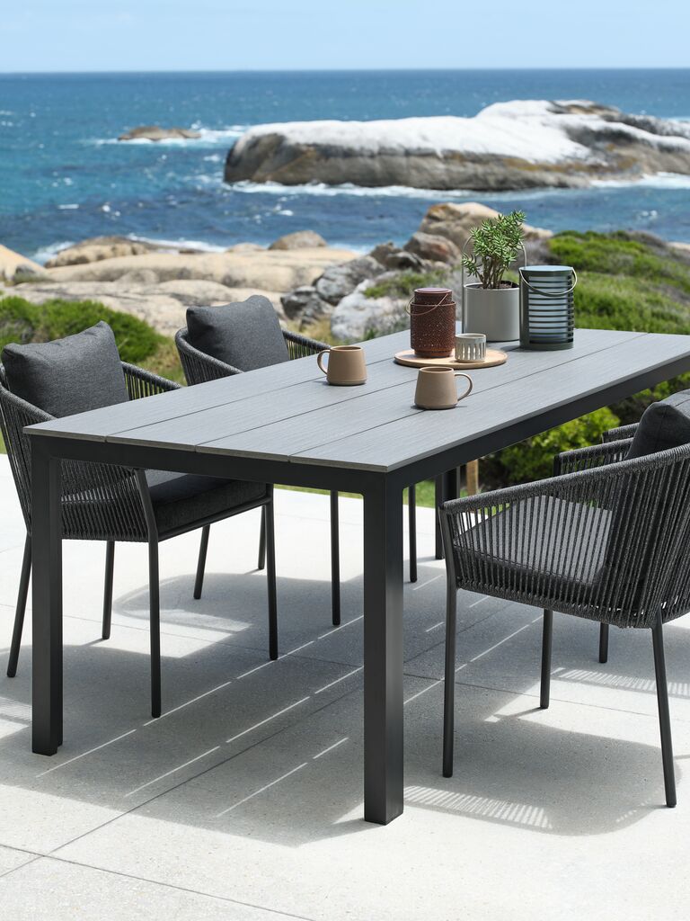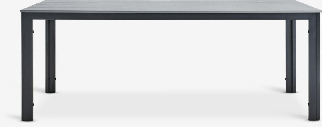 Gråt havebord med bordplade i kunsttræ. Stel og ben i pulverlakeret aluminium. Kunstigt træ har udseende og tekstur som naturtræ uden behov for vedligeholdelse. Aluminium er et let og robust materiale, der ikke ruster. B90 x L205 x H74 cm