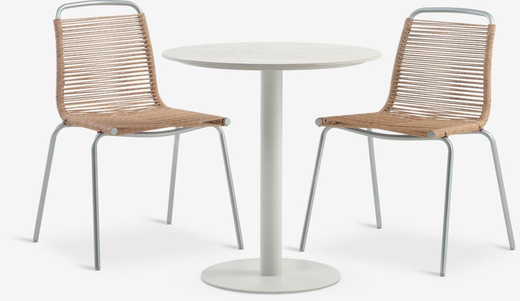 2-personers cafésæt. Bord: Stål og sintret sten. Bordpladen i sintret sten er modstandsdygtig over for ridser, pletter og varme. Ø70 x H72 cm. Stol: Stål og polyrattan. Stabelbar.