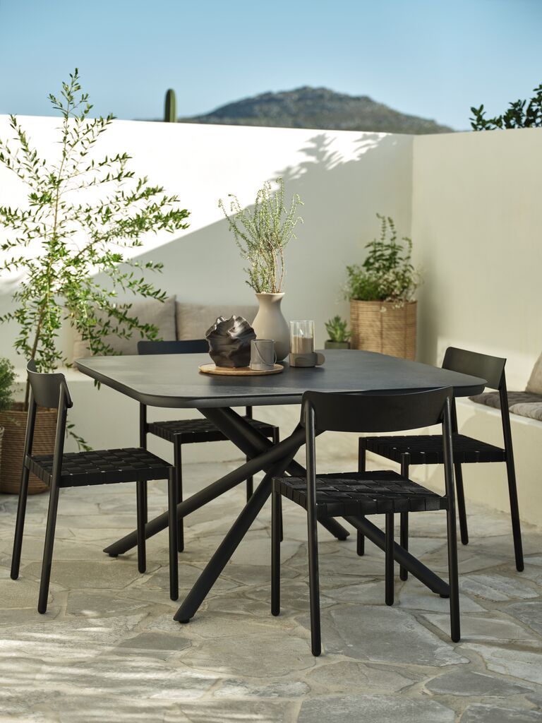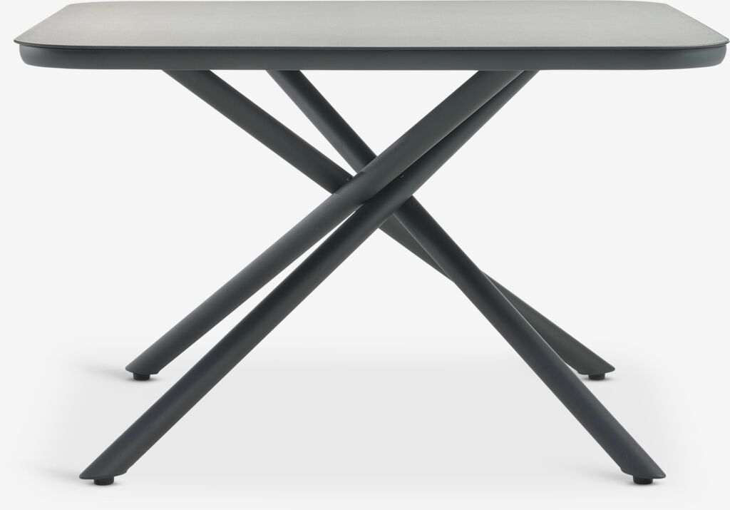 4-personers havemøbelsæt. Bord: Stål og hærdet glas. B120 x L120 x H73 cm. Stol: Aluminium og polyester. Stabelbar.