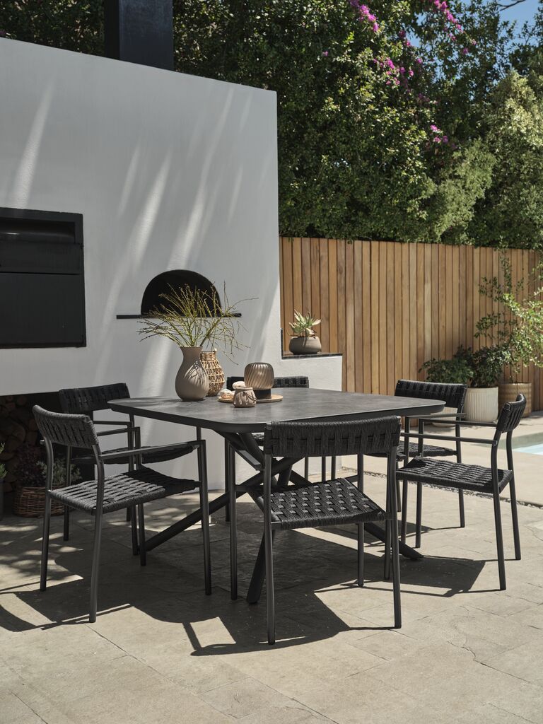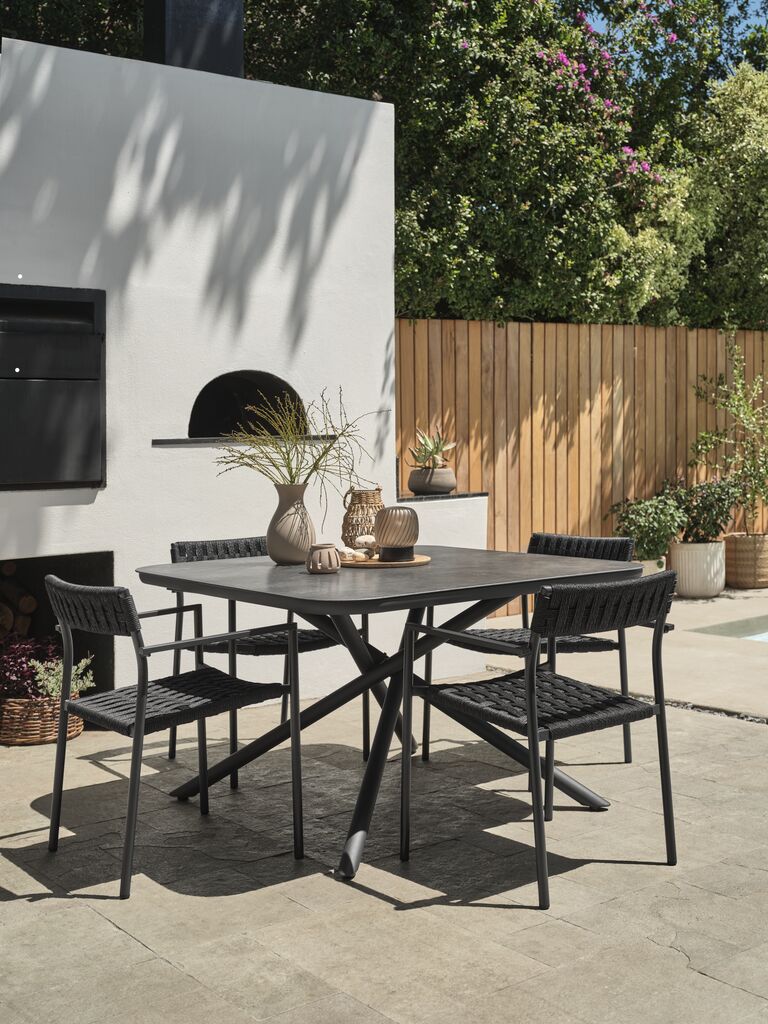 4-personers havemøbelsæt. Bord: Stål og hærdet glas. B120 x L120 x H73 cm. Stol: Stål og polyrattan. Stabelbar.