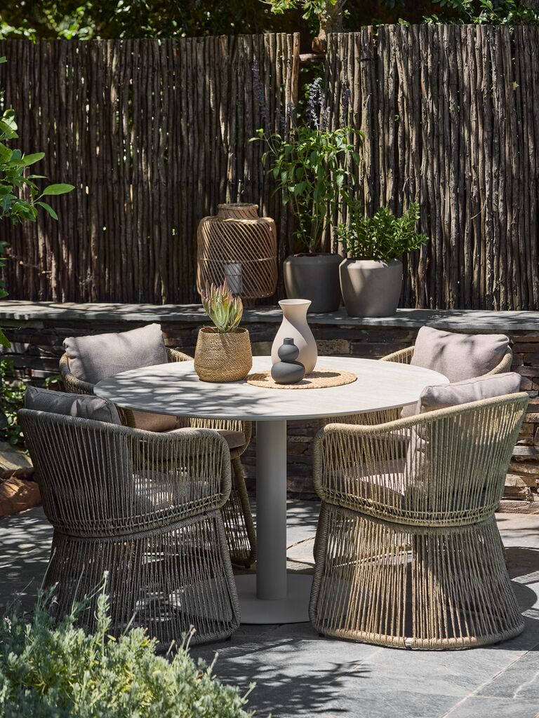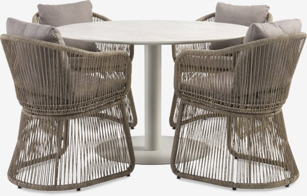4-personers havemøbelsæt. Bord: Stål og cement. Ø120 x H74 cm. Stol: Stål- og polyethylenreb. Inkl. luksushynder med slidstærkt, strukturvævet betræk.