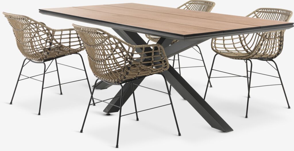 4-personers havemøbelsæt. Aluminium og DURAWOOD® komposittræ. DURAWOOD® er et slidstærkt kompositmateriale bestående af FSC®-træfibre og plast. B100 x L215 x H75 cm. Stol: Stål og polyrattan.