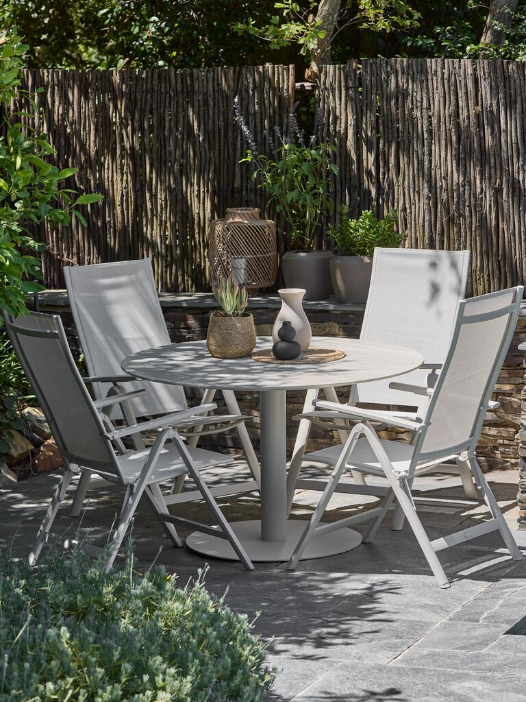 Beige lænestol med sæde og ryglæn i textilin og stel i pulverlakeret aluminium. Ryglænet kan lænes tilbage i 6 positioner. Textilin er et behageligt, farveægte materiale, der tørrer hurtigt og er nemt at rengøre. Aluminium er et let og robust materiale, der ikke ruster. Havestolen kan foldes fladt, hvilket gør den nem at bære og opbevare.