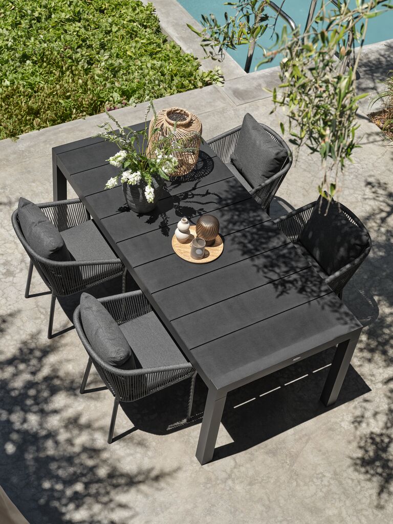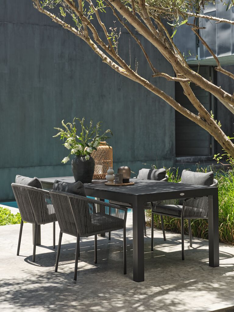 Grå stabelstol i pulverlakeret aluminium med ryglæn i polyester. Inklusive luksushynder med hurtigtørrende, strukturvævet betræk. Betrækket har en vandtæt belægning på indersiden, der forhindrer vand i at trænge ind i hynden. Aluminium er et let og robust materiale, der ikke ruster. Havestolen kan stables for kompakt opbevaring.