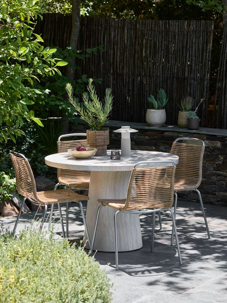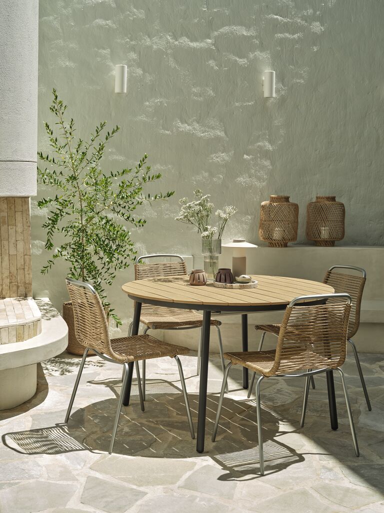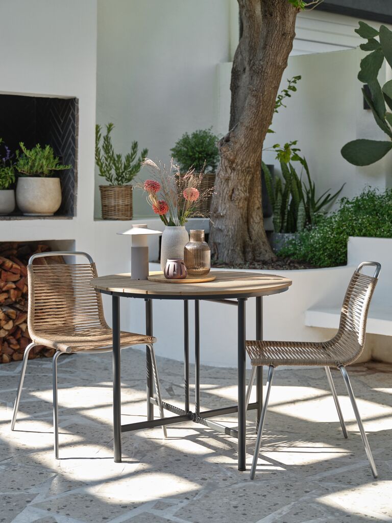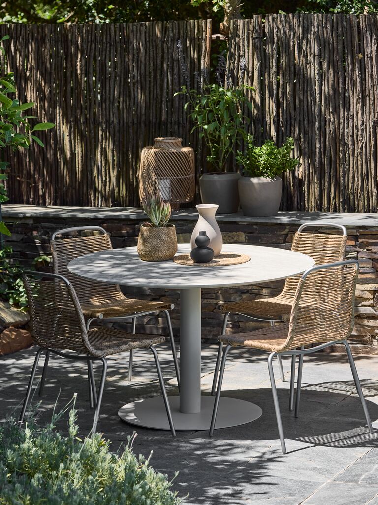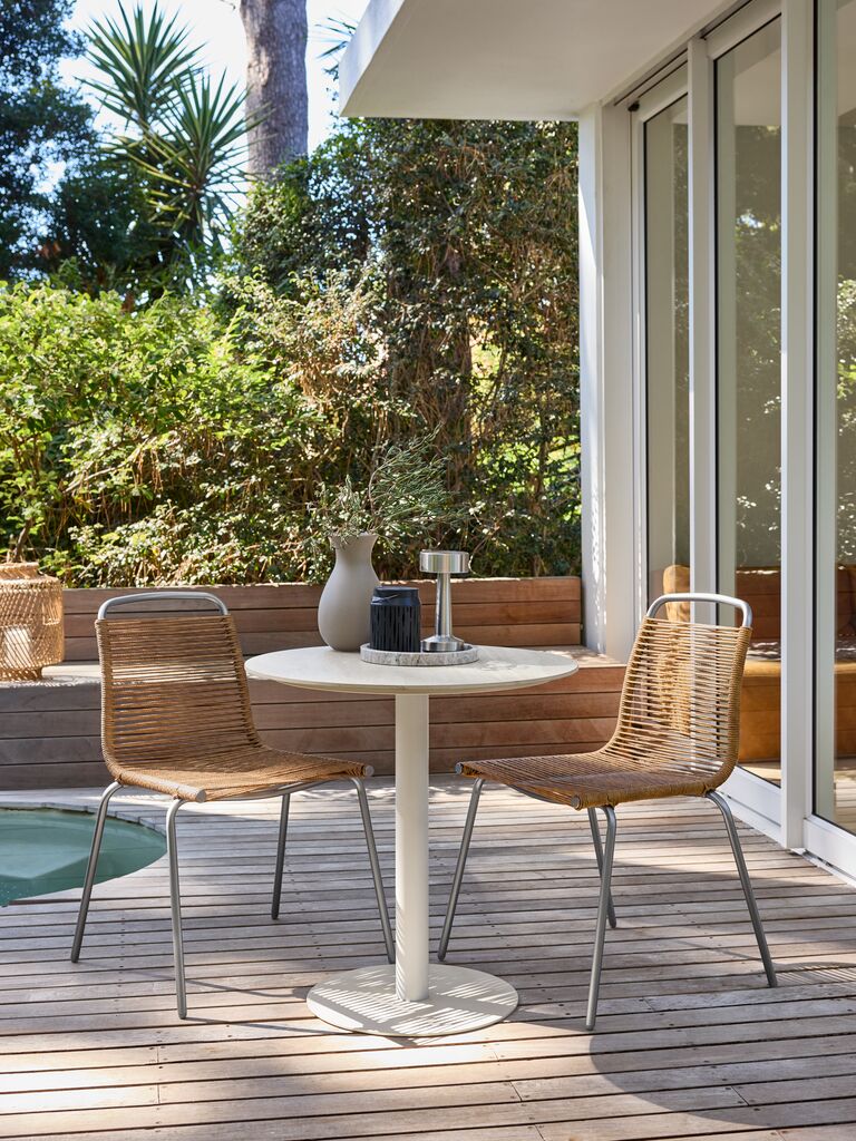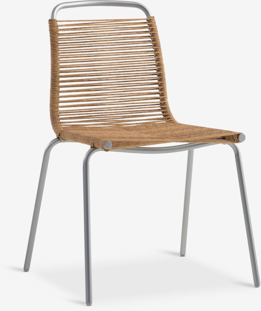Stabelstol med sæde og ryglæn i polyrattan og stel i pulverlakeret stål med børstet kromlook. Polyrattan giver et naturligt fletlook, samtidig med at det er vejrbestandigt og vedligeholdelsesfrit. Havestolen kan stables for kompakt opbevaring.