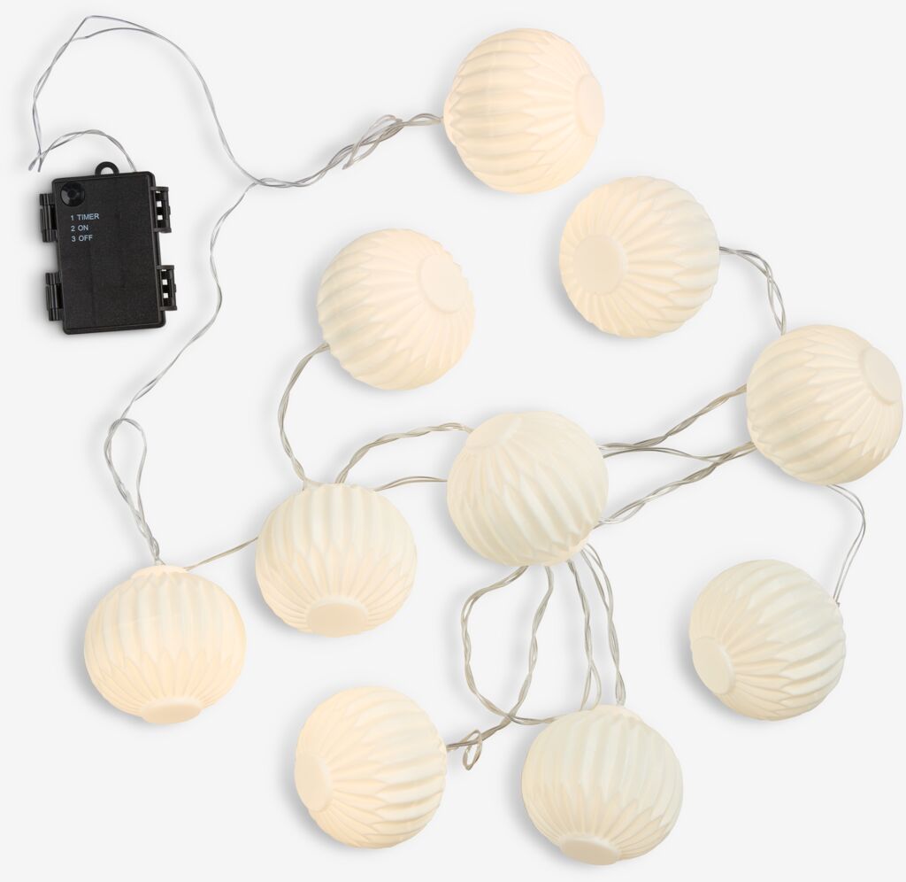 Udendørs lyskæde med 10 dekorative, rillede LED-pærer, der skaber en hyggelig atmosfære på en altan eller terrasse. Det batteridrevne design giver fleksibel placering og inkluderer en praktisk timerfunktion til automatisk belysning. Kræver 3 AA-batterier (medfølger ikke). L365 x Ø8 cm