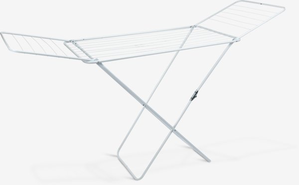 Tørrestativ med 18 meter tørreplads, der rummer 1-2 vaske. Hvid stålramme med udfoldelige vinger, der kan rumme det lange vasketøj. Dens X-formede ben har en sikkerhedslås for bedre stabilitet. Den smalle bredde gør den nem at få gennem døråbninger. Sammenklappelig for nem opbevaring. B55 x L103/171 x H89/99 cm