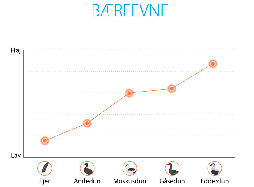 Det betyder konkret, at der skal mere fyld til at lave en varm dyne, hvis bæreevnen er lav, og at en tynd dyne stadig kan være varm, hvis bæreevnen er høj.