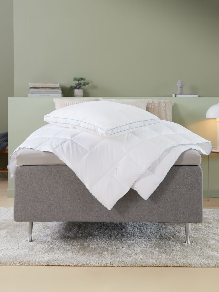 Fiberdyne 135x200 cm med unikt, dunlignende fyld af silikoniserede Trevira Fibelle-fiberdun, 600 g. De bløde, lette fiberdun bevarer deres volumen. Blødt bolster i 100% bomuldscambric. Vask 60°C. Inkl. opbevaringstaske.