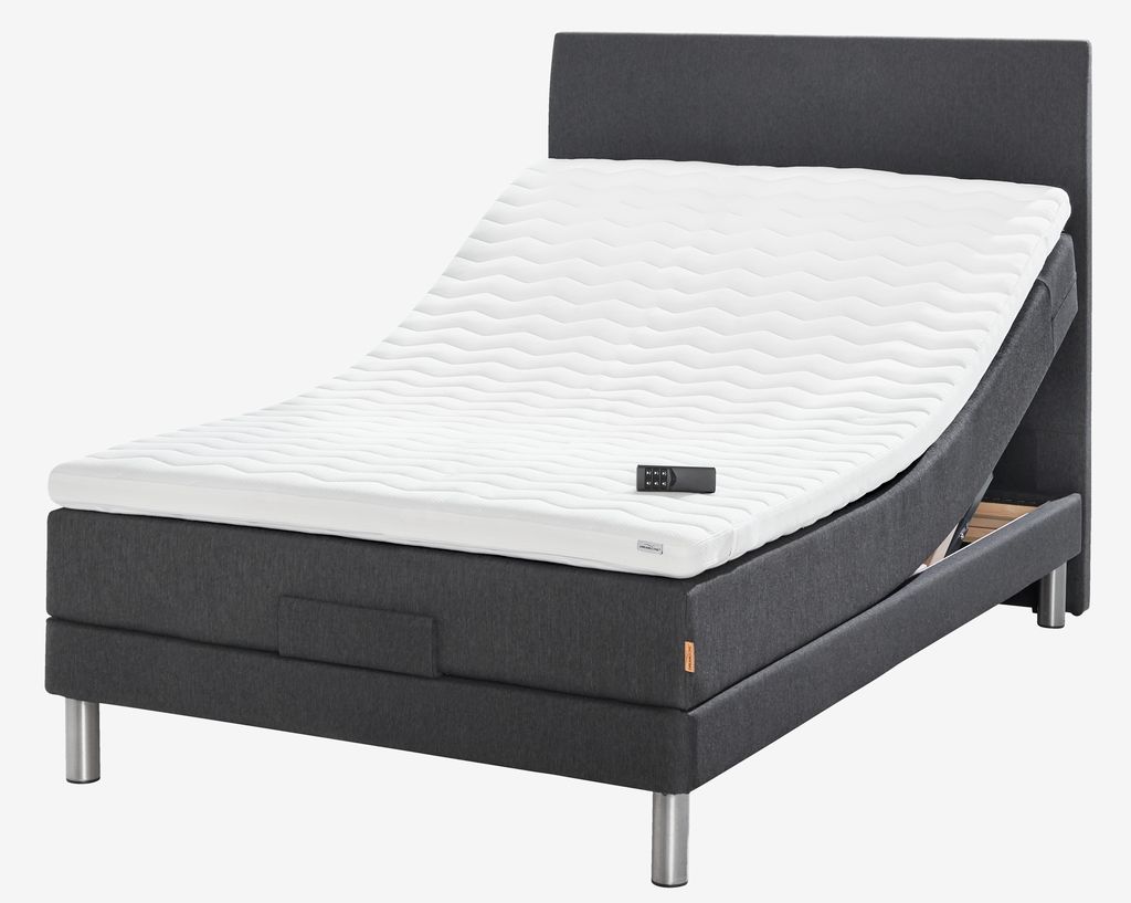 Elevationsseng 120x200 cm med trådløs fjernbetjening. 1 springmadras med pocket-fjedre 250/m², polstret med purskum. Madrassen er inddelt i 7 komfortzoner, hvilket giver en unik, ergonomisk korrekt støtte. 1 topmadras, 8 cm tyk med kerne af åndbar latex, som effektivt leder overskydende varme væk. Vaskbart strækbetræk med blød, kraftig quiltning. 1 elevationsbund. Inkl. ben. Ekskl. gavl.