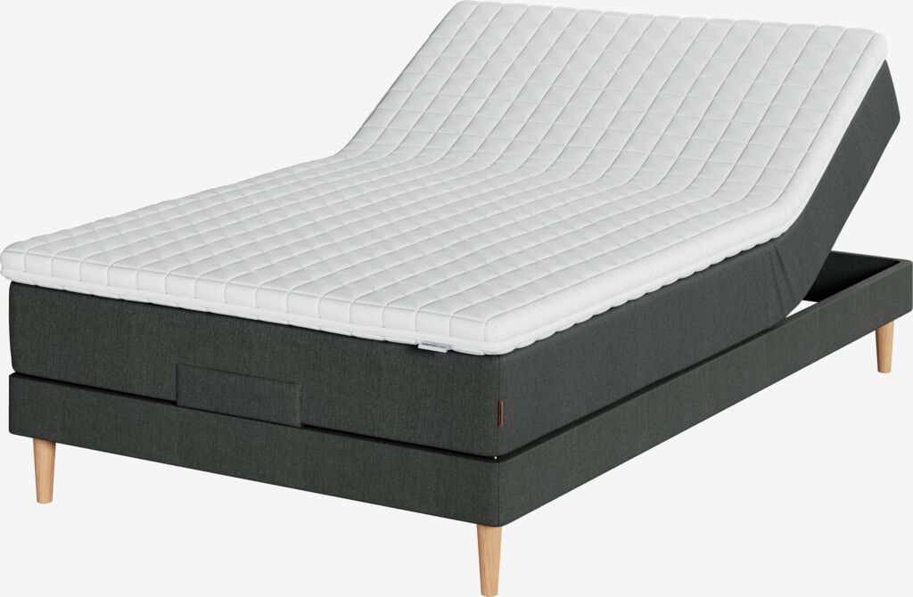Elevationsseng 120x200 cm med trådløs fjernbetjening. Springmadras med pocket-fjedre 226/m², polstret med purskum. madrassen er inddelt i 5 komfortzoner, hvilket giver en præcis og optimal støtte. Topmadras, 5 cm tyk med kerne af åndbar latex, som effektivt leder overskydende varme væk. Vaskbart betræk i 100% polyestermikrofiber (100% genanvendt) med blød, kraftig quiltning. 1 elevationsbund. Ekskl. gavl og ben.