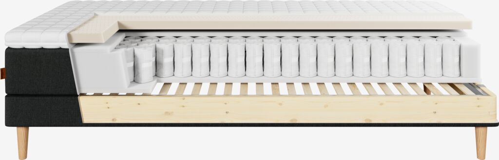 | Springlag 1 (øverst) | 15 cm Hver pocket-fjeder er indkapslet i en stofpose, hvilket giver en fleksibel madras, forlænger levetiden samt reducerer støj. |