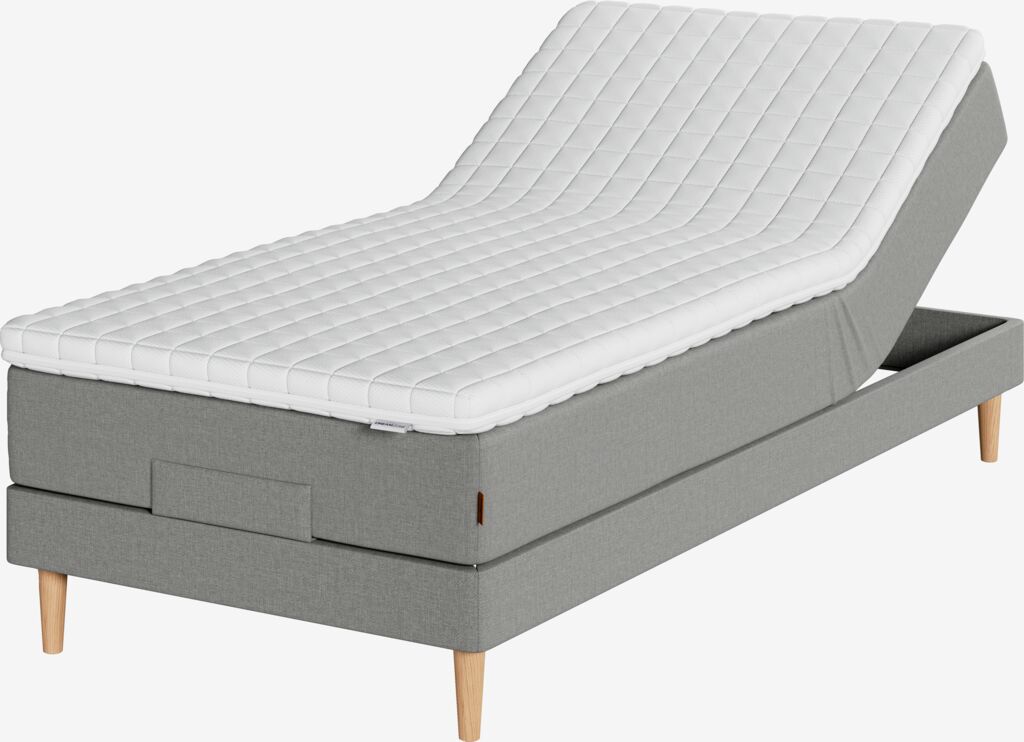 Elevationsseng 80x200 cm med trådløs fjernbetjening. 1 springmadras med pocket-fjedre 226/m², polstret med purskum. madrassen er inddelt i 5 komfortzoner, hvilket giver en præcis og optimal støtte. 1 topmadras, 5 cm tyk med kerne af trykaflastende memory foam, der former sig præcist efter kroppen. Vaskbart betræk i 100% polyester (100% genanvendt) med blød, kraftig quiltning. 1 elevationsbund. Ekskl. gavl og ben.