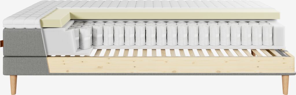 | Springlag 1 (øverst) | 15 cm Hver pocket-fjeder er indkapslet i en stofpose, hvilket giver en fleksibel madras, forlænger levetiden samt reducerer støj. |