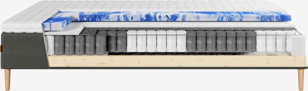 Dobbeltfjedret boxmadras 160x200 cm med 5 komfortzoner, som giver en præcis og optimal støtte. Øverst pocket-fjedre 250/m², polstret med purskum. Nederst bonell-fjedre 150/m². Inkl. 5 cm tyk topmadras med kerne af trykaflastende gel-skum, der tilpasser sig kroppen og leder overskydende varme væk. Vaskbart betræk i 100% polyester (100% genanvendt) med blød, kraftig quiltning. Ekskl. ben.