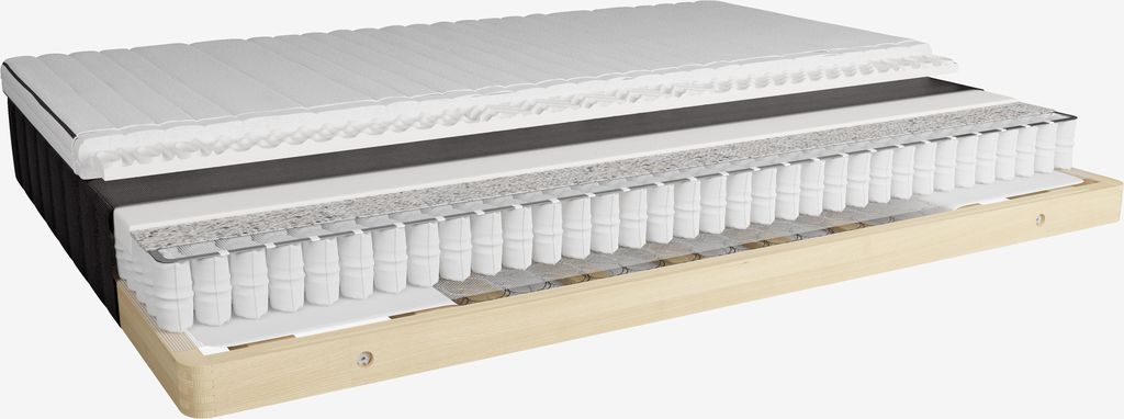Dobbeltfjedret boxmadras 90x200 cm med 5 komfortzoner, som giver en præcis og optimal støtte. Øverst pocket-fjedre 250/m², polstret med purskum. Nederst minibonell-fjedre 150/m². Inkl. 4 cm tyk topmadras med kerne af purskum. Vaskbart betræk med let quiltning. Ekskl. ben.