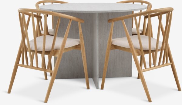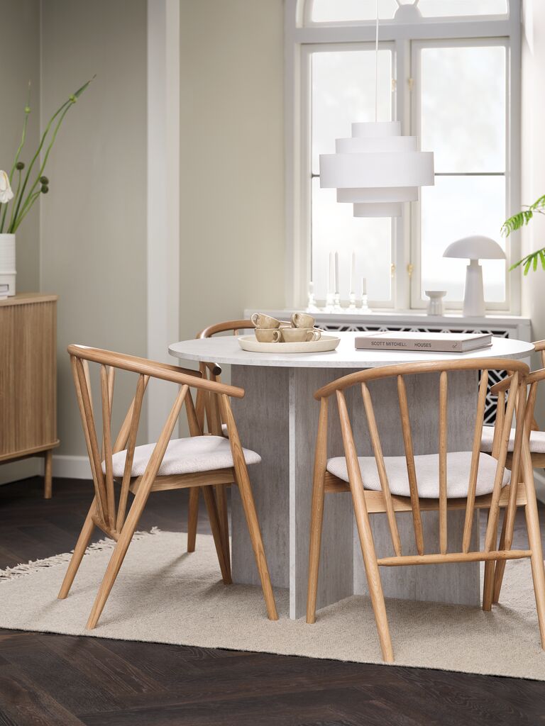 Bord: Kunstfiner. Ø110 x H75 cm. Stol: Stof og massiv eg.
