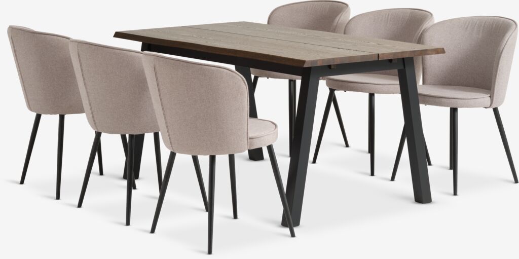 Bord: Massiv eg og egefiner. Ekskl. tillægsplader. B90 x L160 x H76 cm. Stol: Stof og stål.