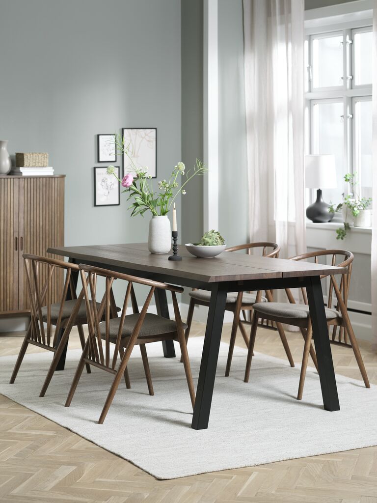 Bord: Massiv eg og egefiner. Ekskl. tillægsplader. B90 x L200 x H76 cm. Stol: Stof og massiv eg.