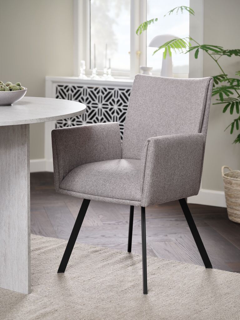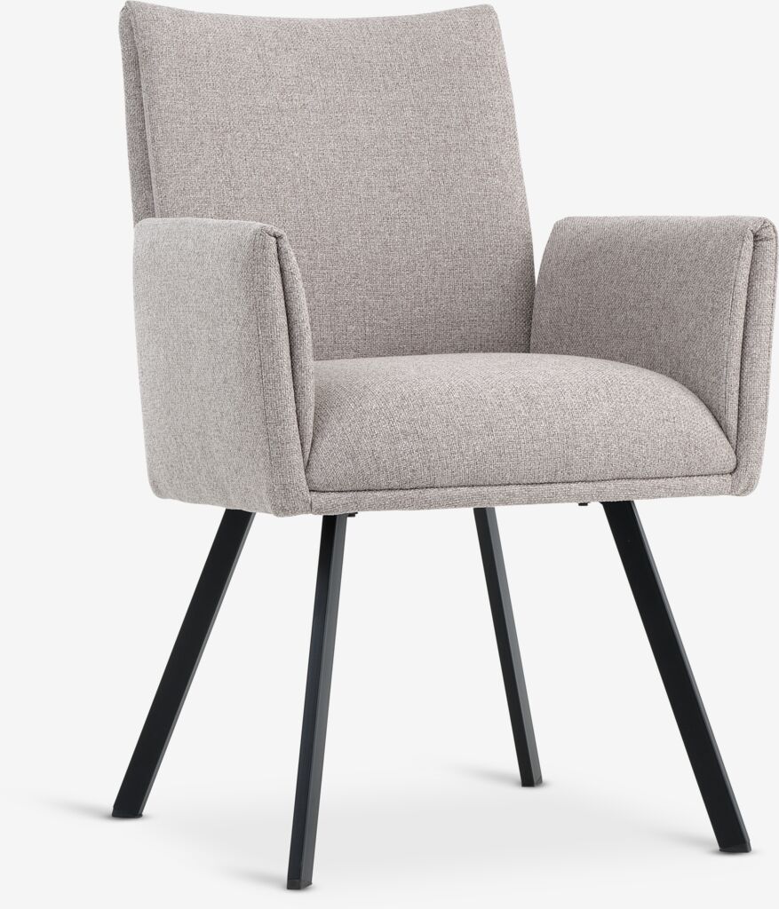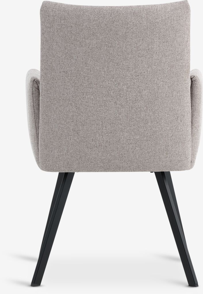 Spisebordsstol med armlæn, der giver ekstra støtte og komfort. Stolen har et polstret sæde med pocket-fjedre og et ryglæn i beige stof. Sorte ben i stål.