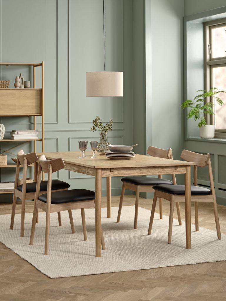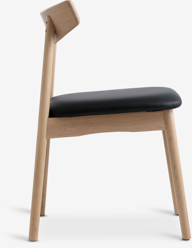 Spisebordsstol med polstret sæde i sort kunstlæder og stel i massiv eg. Træet er lakeret for at forlænge holdbarheden.