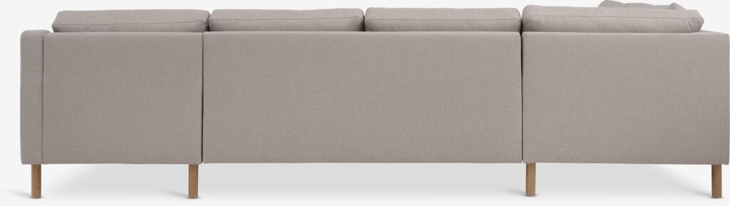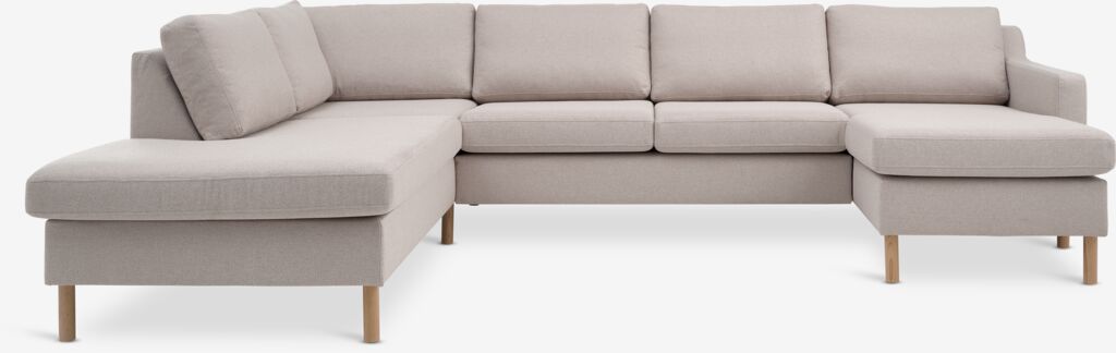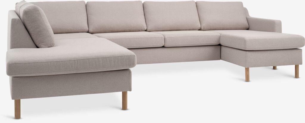 6-personers sofa i stof. Sæde- og ryghynder i skum. Ben i massiv eg. Kan ikke spejlvendes. B292 x H78 x D90/137/201 cm